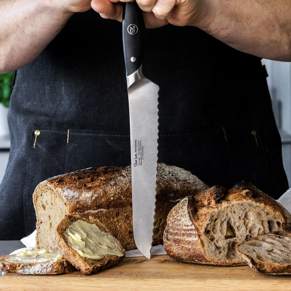 The 22cm bread knife features a pointed tip and serrated blade, which will easily cut through crusty bread and loaves without squashing or tearing. Fully forged from high quality German stainless steel with a classically shaped DuPontâ„¢ handle.
