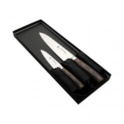 The Tamahagane San Tsubame Wood 2 Piece Boxed Knife Set includes the SN-1106-18cm Chef’s Knife and SN-1109-9cm Pairing Knife.