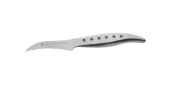 The Tojiro Sharaku Mono 7cm Peeling Knife (FJS-19) is part of the Sha Ra Ku Mono range which has a distinctive angular pattern, to call back to the traditional Samurai sword, whilst the black dot motif in the handle represents a row of urban windows. The perfect knife for peeling, paring and chopping smaller food items. It is also used to make a cut known as a tourné cut in vegetables such as carrots. It is a specialised type of paring knife.