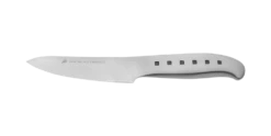 The Tojiro Sharaku Mono 11cm Utility Knife (FJ-07) is part of the Sha Ra Ku Mono range which has a distinctive angular pattern, to call back to the traditional Samurai sword, whilst the black dot motif in the handle represents a row of urban windows. Versatile, smaller knife for slicing, mincing and prep work. The utility knife is between a chef’s knife and paring knife in size. A great multipurpose knife for fruits, vegetables with fine skins or soft insides. Ideal knife for slicing salami, sausage, avocados and small soft or hard-crusted bread.