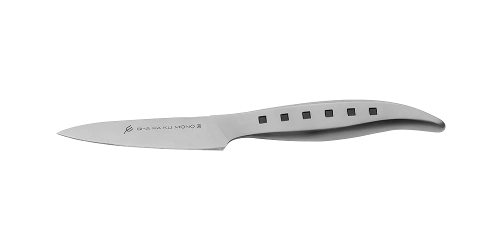 The Tojiro Sharaku Mono 9cm Paring Knife (FJS-20) is part of the Sha Ra Ku Mono range which has a distinctive angular pattern, to call back to the traditional Samurai sword, whilst the black dot motif in the handle represents a row of urban windows. A multipurpose small knife that is great for hand peeling, precision cutting, slicing and detail cuts. Perfect knife to devein shrimp, and for removing seeds from chilli peppers and skinning or cutting small garnishes.