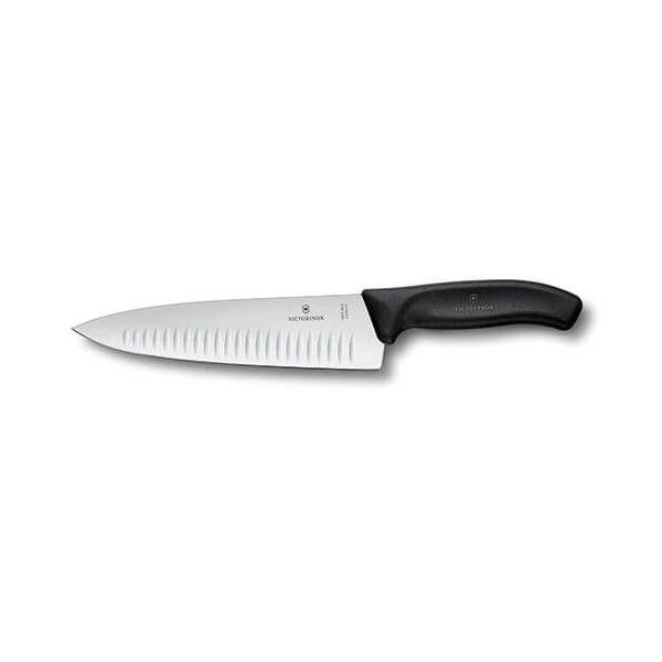 Victorinox Swiss Classic 20cm Carving Knife Fluted Blade Black is a Swiss made, high-carbon, stainless steel blade that is perfect for carving a wide variety of meats.