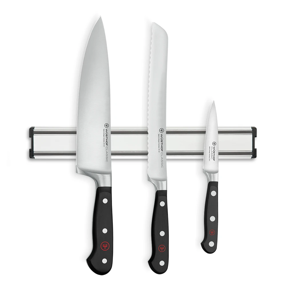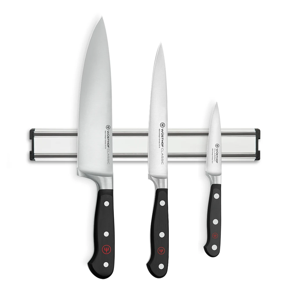 This Wusthof Classic 3 Piece Magnetic Knife Rack Set includes the Wusthof Classic 20cm Cooks Knife, Wusthof Classic 16cm Utility Knife, Wusthof Classic 9cm Paring Knife and 30cm Magnetic Knife Rack.